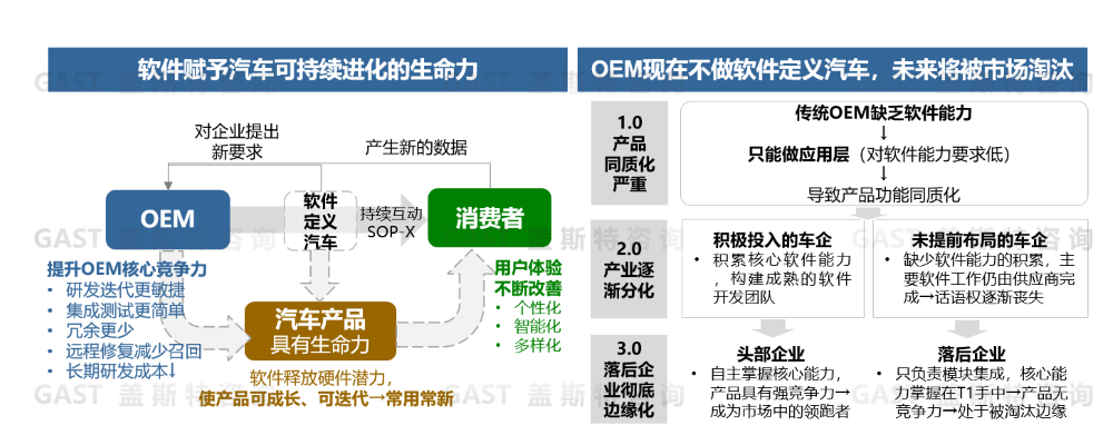 軟件主導(dǎo)下的汽車是“新物種”,可為汽車創(chuàng)造體驗,在這一過程中軟件是打通數(shù)據(jù)到體驗循環(huán)的關(guān)鍵要素,使汽車具有生命力,同時又滿足企業(yè)與用戶的需求。因此,未來十年軟件定義汽車必將成為OEM的絕對競爭力,OEM現(xiàn)在若不做軟件定義汽車,未來就將被市場淘汰。