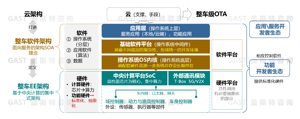 軟件定義汽車的核心是實現(xiàn)軟硬解耦,以軟件架構(gòu)為主導(dǎo),硬件資源整合為核心驅(qū)動力,打造軟硬件平臺,支撐應(yīng)用及功能生態(tài)構(gòu)建。軟件定義汽車需要軟件主導(dǎo)整車硬件和功能設(shè)計,將計算與通訊作為關(guān)鍵支撐,最終通過OTA方式加以實現(xiàn)。