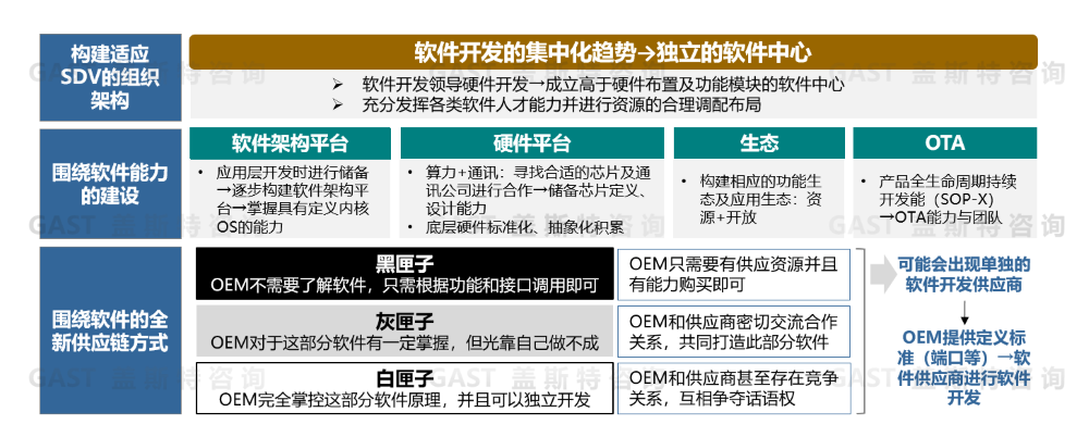 傳統(tǒng)OEM的“大象轉(zhuǎn)身”是一個復(fù)雜的系統(tǒng)工程,因為理念的轉(zhuǎn)變最難,需要從內(nèi)部組織架構(gòu)、能力建設(shè)、開發(fā)流程上進行改變,最終才能建立軟件團隊、打造軟硬平臺、實現(xiàn)基于OTA的產(chǎn)品SOP-X。要想實現(xiàn)軟件定義汽車,傳統(tǒng)OEM首先需要構(gòu)建適應(yīng)SDV的組織架構(gòu),其次需圍繞軟件能力建設(shè)軟件架構(gòu)平臺、硬件平臺、功能與應(yīng)用生態(tài)、OTA能力,最后還需構(gòu)建全新的供應(yīng)鏈方式。