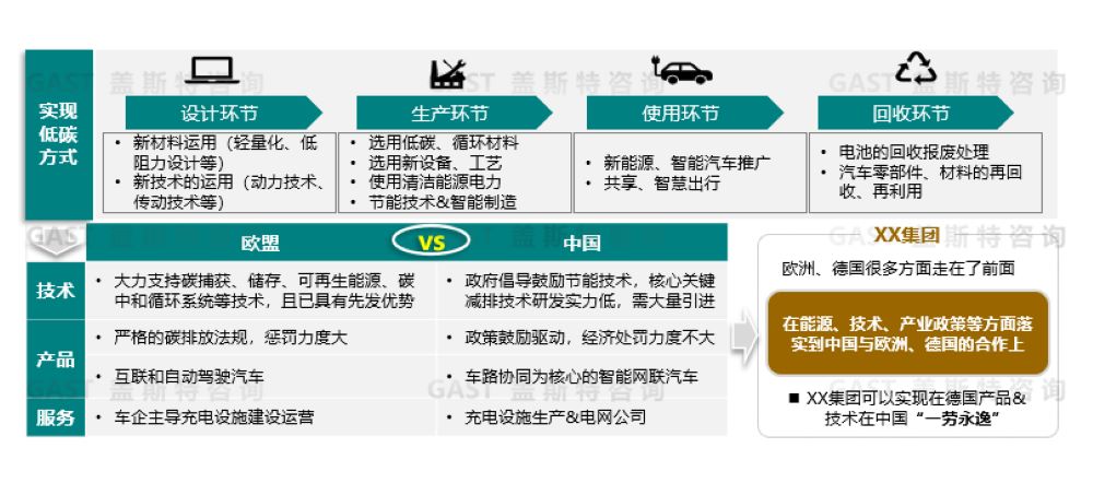 汽車產(chǎn)業(yè)實(shí)現(xiàn)低碳化的方式,應(yīng)立足于汽車全生命周期的主要環(huán)節(jié),深入挖掘技術(shù)、產(chǎn)品和服務(wù)等方面的減排潛力。根據(jù)歐盟和中國在應(yīng)對低碳化舉措的差異,XX集團(tuán)需要結(jié)合自身的資源稟賦,聚焦于綠色低碳發(fā)展,推動低碳發(fā)展規(guī)劃在國家、地區(qū)層面的對接,制定形成XX集團(tuán)的在中國市場的低碳大戰(zhàn)略。