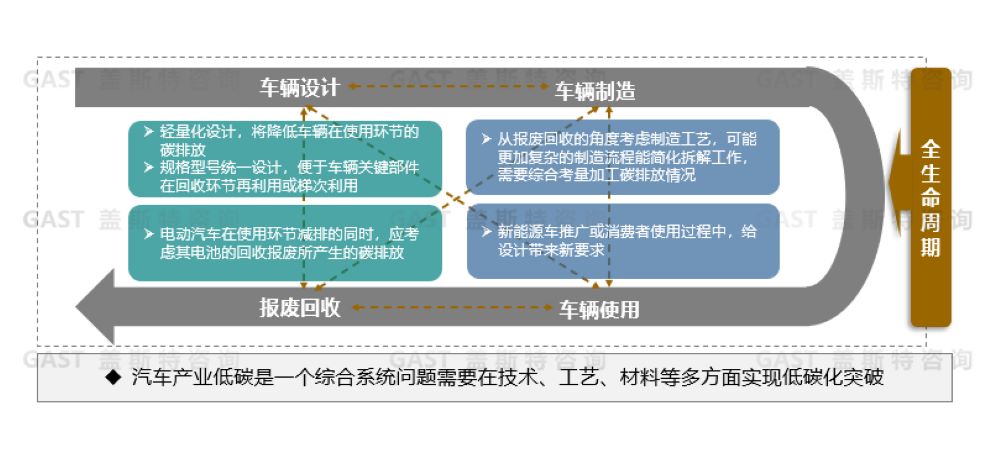 要想實(shí)現(xiàn)車企的減排目標(biāo),必須從產(chǎn)業(yè)鏈視角切入,站全生命周期維度去深入挖掘,從設(shè)計(jì)、制造、使用、服務(wù)到報(bào)廢等每個關(guān)鍵環(huán)節(jié)尋求低碳突破,相互配合,相互協(xié)調(diào),最終實(shí)現(xiàn)整個汽車產(chǎn)業(yè)全生命周期的低碳目標(biāo)。