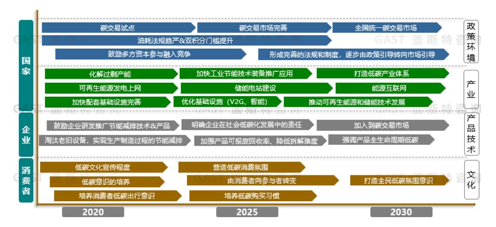 自雙碳目標(biāo)提出以來,中國政府在應(yīng)對低碳化方面采取了一系列積極舉措,從國家、產(chǎn)業(yè)、企業(yè)和消費(fèi)者角度分別予以制定各階段的低碳路線,明確低碳化發(fā)展方向和具體路徑。