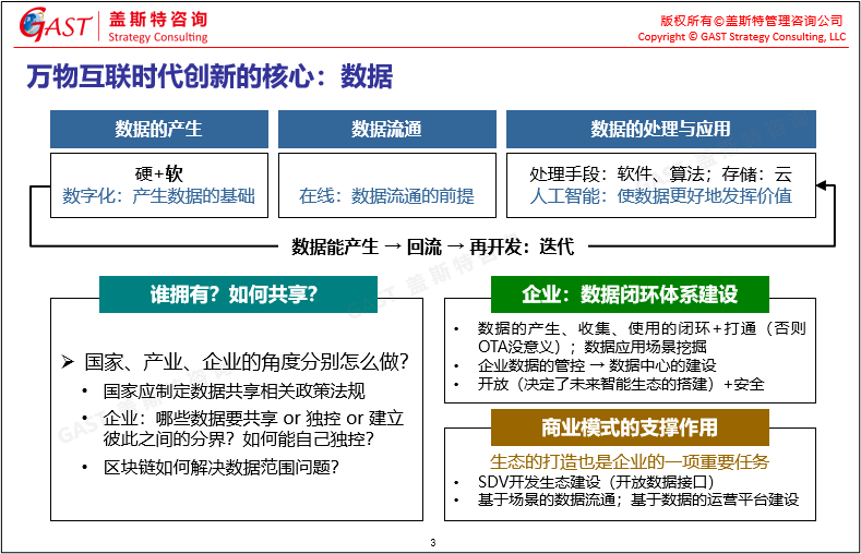萬物互聯(lián)時代創(chuàng)新的核心:本輪產(chǎn)業(yè)變革,最核心的要素是數(shù)據(jù),只有實現(xiàn)基于數(shù)據(jù)的產(chǎn)生、流通、加工處理、回流與再開發(fā),即基于數(shù)據(jù)的迭代,才能使產(chǎn)品持續(xù)進化。萬物互聯(lián)時代的所有創(chuàng)新必須圍繞數(shù)據(jù)進行,數(shù)據(jù)作為最重要的資源,到底誰擁有?如何共享?需要國家、產(chǎn)業(yè)和企業(yè)做好相應的分工。