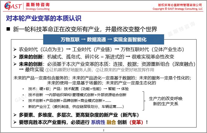 對本輪產(chǎn)業(yè)變革的本質認識:新一輪科技革命的核心是萬物互聯(lián),只有萬物互聯(lián)才能帶來數(shù)據(jù)的流通,最終實現(xiàn)社會的全面智能化,企業(yè)要想在本輪產(chǎn)業(yè)重構中勝出,就必須拋棄以前的漸進式創(chuàng)新,進行系統(tǒng)性、融合性、顛覆性的創(chuàng)新——即變革。