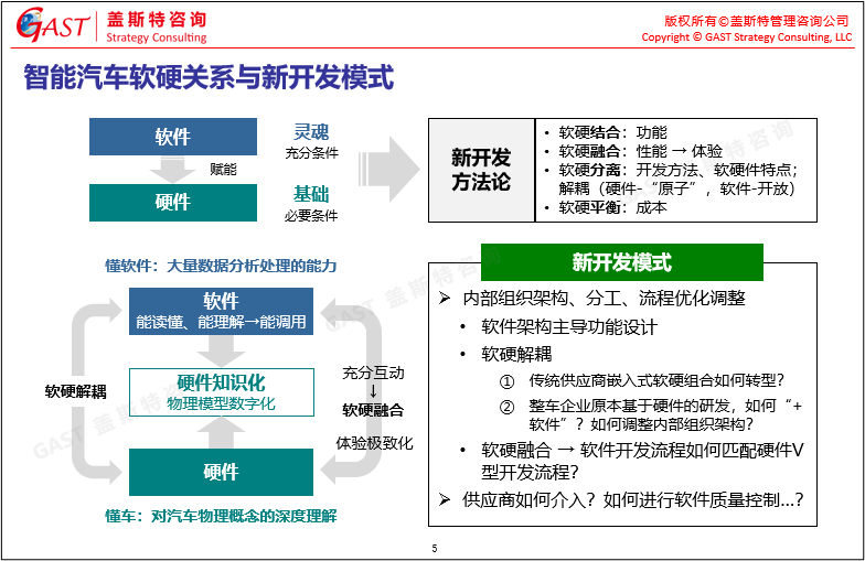 智能汽車軟硬關系與新開發(fā)模式:智能汽車的軟件、硬件都非常重要,軟件是靈魂、是充分條件,硬件是基礎、是必要條件,只有軟硬件有效組合,才能構成智能汽車。未來智能汽車的開發(fā)需要有符合智能汽車的新方法論、新開發(fā)模式:一定是軟硬結合、軟硬融合、軟硬解耦、軟硬平衡的。