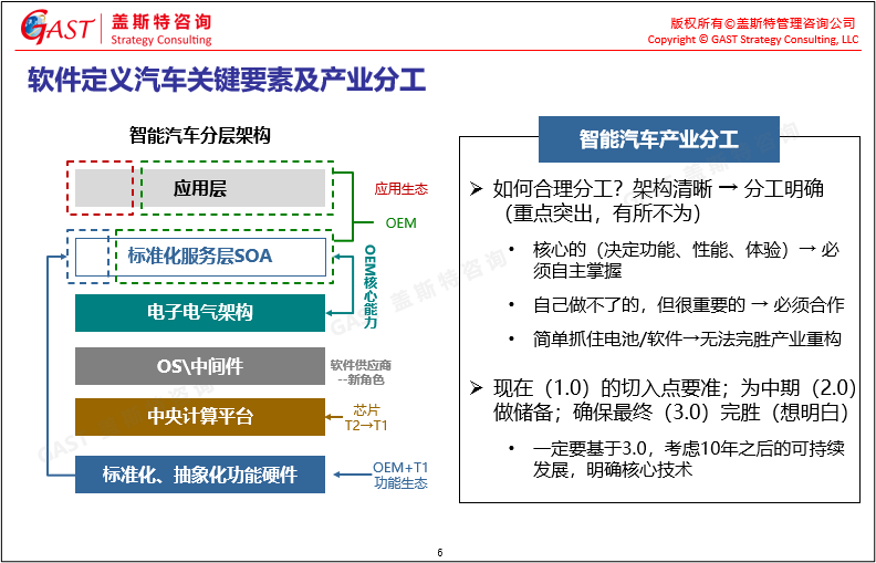 軟件定義汽車關鍵要素及產(chǎn)業(yè)分工:新生產(chǎn)關系中很重要的問題就是產(chǎn)業(yè)分工問題,只有將軟件定義汽車的架構、要素真正研究清楚,才能明確如何分工:哪些是必須自主掌握的核心?哪些應該由誰來提供?當前1.0階段應從哪兒切入?2.0應儲備什么?最終一定要基于3.0,考慮到10年后的發(fā)展,因此必須掌握哪些核心技術?