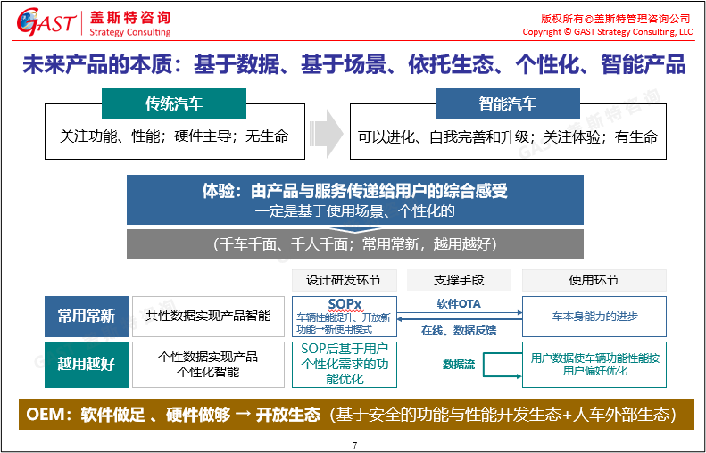 未來汽車產(chǎn)品的本質:一定是基于數(shù)據(jù)、基于場景、依托生態(tài)、個性化、可不斷進化的智能產(chǎn)品,最終帶給用戶常用常新,越用越好,千人千面、千車千面的體驗。