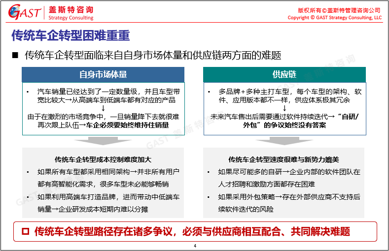 傳統(tǒng)OEM轉(zhuǎn)型難點(diǎn):傳統(tǒng)車企轉(zhuǎn)型面臨來自自身市場體量和供應(yīng)鏈兩方面的難題,從自身市場體量角度來看必須始終維持住銷量,從供應(yīng)鏈角度來看,未來汽車售出后需要通過軟件持續(xù)迭代,而自研還是外包的爭議始終沒有答案。