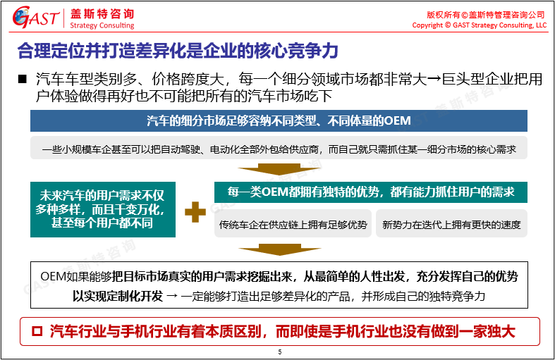 合理定位并打造差異化是OEM的核心競爭力:汽車的細(xì)分市場足夠容納不同類型、不同體量的OEM。未來汽車的用戶需求不僅多種多樣,而且千變?nèi)f化,每一類OEM都擁有獨(dú)特的優(yōu)勢,都有能力抓住用戶的需求。