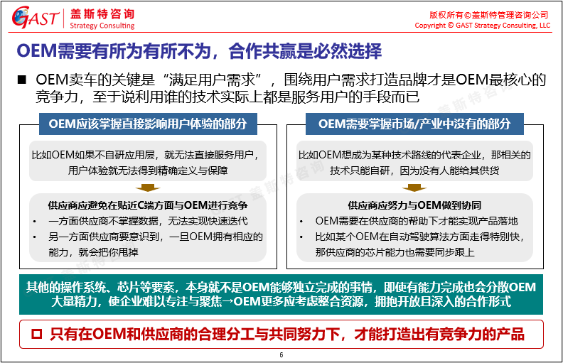 合作共贏是OEM的必然選擇:OEM賣車的關(guān)鍵是“滿足用戶需求”,圍繞用戶需求打造品牌才是OEM最核心的競爭力,OEM應(yīng)該掌握直接影響用戶體驗(yàn)的部分如自研應(yīng)用層,而其他如操作系統(tǒng)、芯片等要素應(yīng)考慮整合資源,采用擁抱開放且深入的合作形式。