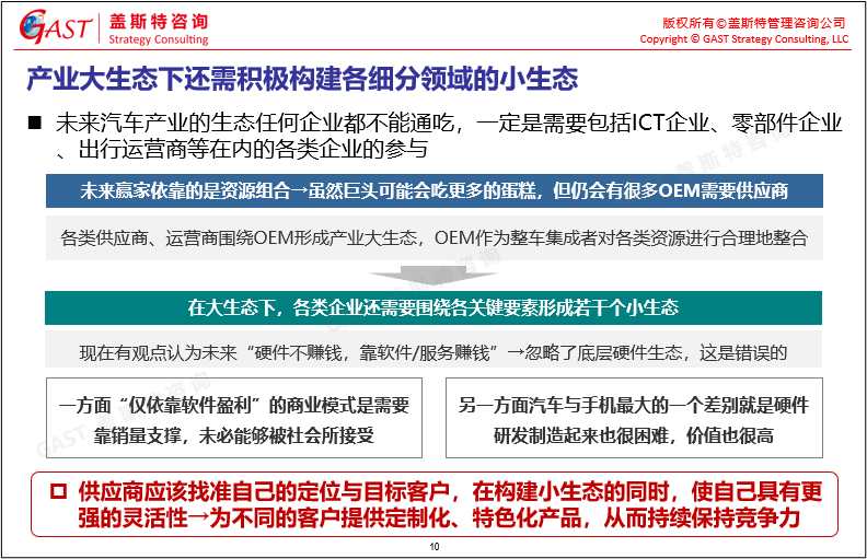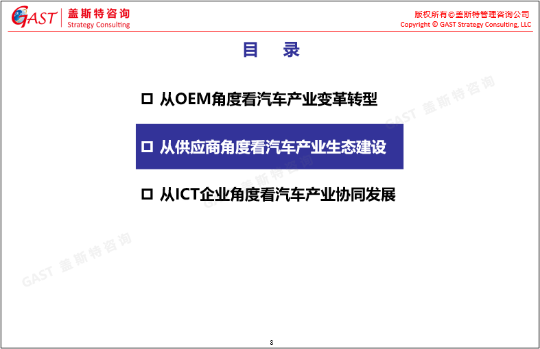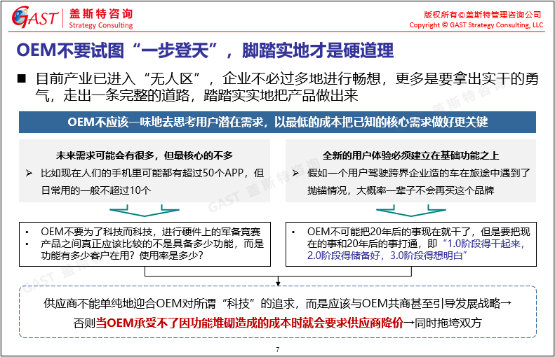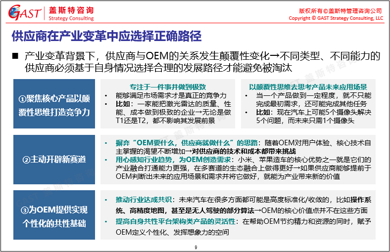 供應(yīng)商在產(chǎn)業(yè)變革中應(yīng)選擇正確路徑:聚焦核心產(chǎn)品以顛覆性思維打造競爭力,專注于一件事并做到極致,并以顛覆性思維去思考產(chǎn)品未來應(yīng)用場景。此外,摒棄“OEM要什么,供應(yīng)商就做什么”的思路,感知行業(yè)趨勢來為OEM創(chuàng)造需求,主動開辟新賽道,并為OEM提供實(shí)現(xiàn)個性化的共性基礎(chǔ)。