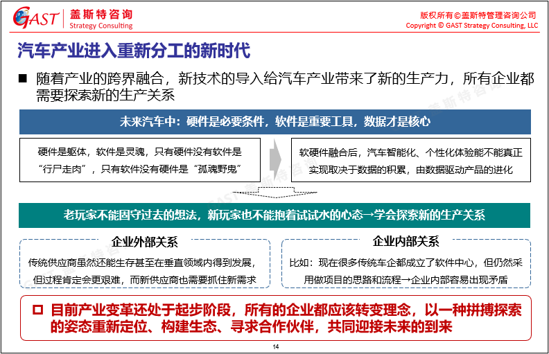 汽車產(chǎn)業(yè)進(jìn)入重新分工的新時(shí)代:隨著產(chǎn)業(yè)的跨界融合,新技術(shù)的導(dǎo)入給汽車產(chǎn)業(yè)帶來了新的生產(chǎn)力,所有企業(yè)都需要探索新的生產(chǎn)關(guān)系。