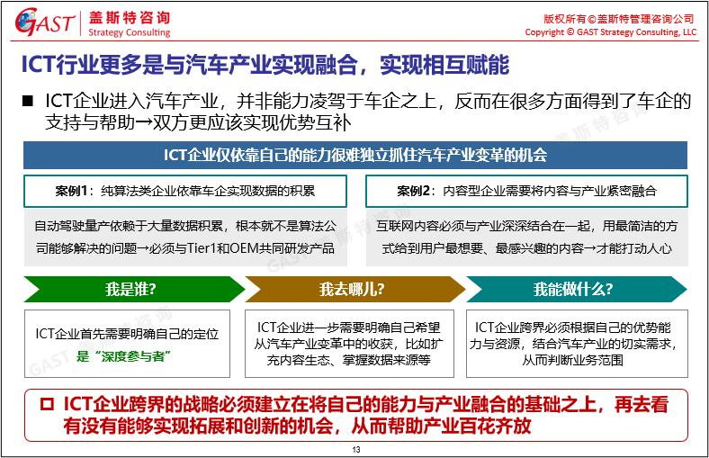 ICT行業(yè)與汽車產(chǎn)業(yè)實(shí)現(xiàn)相互賦能:ICT企業(yè)僅依靠自身很難獨(dú)立抓住汽車產(chǎn)業(yè)變革的機(jī)會,首先需要明確自己的定位是“深度參與者”,進(jìn)一步明確自身在產(chǎn)業(yè)變革中的發(fā)展目標(biāo),并根據(jù)企業(yè)優(yōu)勢能力與資源,結(jié)合汽車產(chǎn)業(yè)的切實(shí)需求,實(shí)現(xiàn)跨界融合。
