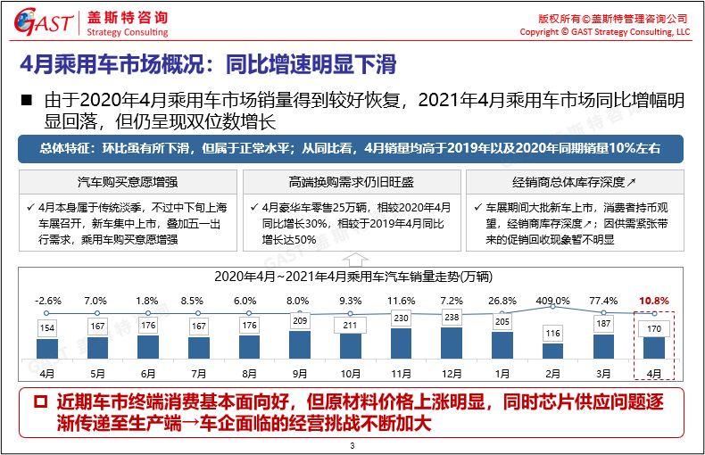 中國(guó)宏觀經(jīng)濟(jì)持續(xù)穩(wěn)定健康發(fā)展,對(duì)車(chē)市消費(fèi)起到較好的促進(jìn)作用。2021年1-4月共銷(xiāo)售874.8萬(wàn)輛,銷(xiāo)量同比增長(zhǎng)51.8%。近期車(chē)市終端消費(fèi)基本面向好,但原材料價(jià)格上漲明顯,同時(shí)芯片供應(yīng)問(wèn)題逐漸傳遞至生產(chǎn)端,車(chē)企面臨的經(jīng)營(yíng)挑戰(zhàn)不斷加大。本報(bào)告圍繞2021年4月中國(guó)車(chē)市銷(xiāo)量走勢(shì)進(jìn)行研究分析。