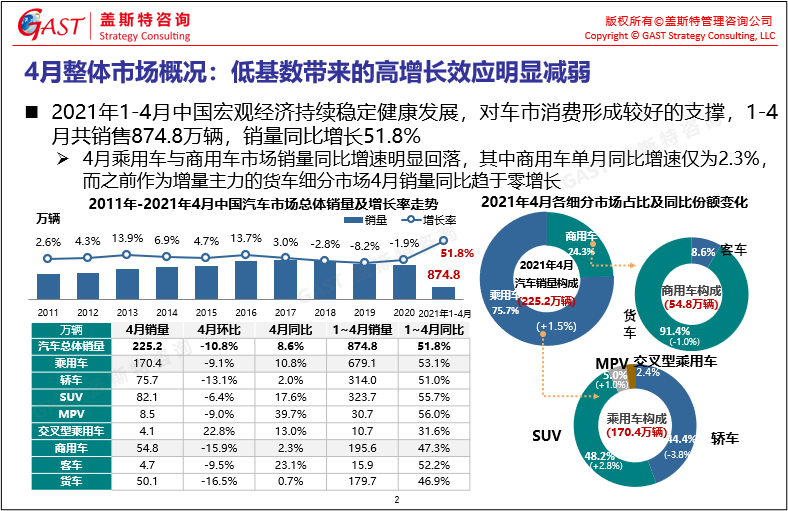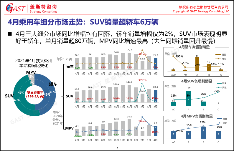 4月乘用車(chē)市場(chǎng)概況:由于2020年4月乘用車(chē)市場(chǎng)銷(xiāo)量得到較好恢復(fù),2021年4月乘用車(chē)市場(chǎng)同比增幅明顯回落,但仍呈現(xiàn)雙位數(shù)增長(zhǎng)。