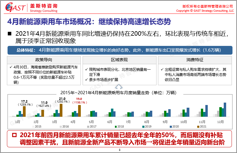 4月新能源乘用車(chē)市場(chǎng)概況:繼續(xù)保持高增長(zhǎng)態(tài)勢(shì),4月銷(xiāo)售21萬(wàn)輛,同比增速達(dá)198%,增速大幅領(lǐng)先于傳統(tǒng)車(chē),2021年前四月新能源乘用車(chē)?yán)塾?jì)銷(xiāo)量已超去年全年的50%。
