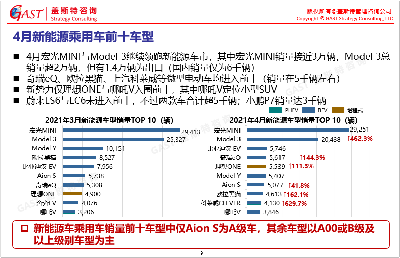 4月新能源乘用車(chē)前十車(chē)型:宏光MINI與Model 3繼續(xù)領(lǐng)跑新能源車(chē)市,銷(xiāo)量均超過(guò)2萬(wàn)輛,但 Model 3有1.4萬(wàn)輛為出口(國(guó)內(nèi)銷(xiāo)量?jī)H為6千輛)。