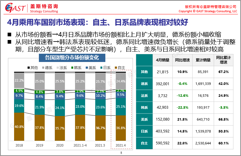 4月乘用車(chē)國(guó)別市場(chǎng)表現(xiàn):自主、日系品牌表現(xiàn)相對(duì)較好,二者增速均在13%以上,德系銷(xiāo)量同比微跌,韓法系下滑幅度達(dá)兩位數(shù)。