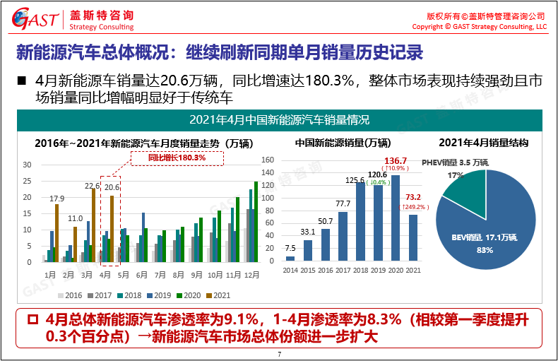 4月新能源汽車(chē)總體概況:4月新能源汽車(chē)銷(xiāo)量達(dá)20.6萬(wàn)輛(同比增速達(dá)180.3%),新能源汽車(chē)滲透率達(dá)9.1%,1-4月總體滲透率為8.3%(2020年滲透率僅為5%),新能源汽車(chē)市場(chǎng)總體份額進(jìn)一步擴(kuò)大。