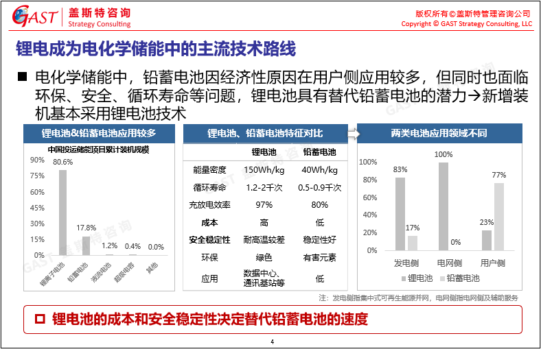 鋰電池儲能技術(shù)路線分析:電化學儲能中,鉛蓄電池因經(jīng)濟性原因在用戶側(cè)應(yīng)用較多,但同時也面臨環(huán)保、安全、循環(huán)壽命等問題,鋰電池具有替代鉛蓄電池的潛力。未來新增裝機基本采用鋰電池技術(shù),鋰電池的成本和安全穩(wěn)定性決定替代鉛蓄電池的速度。