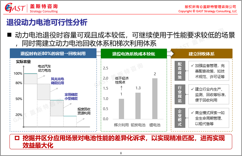 退役動力電池可行性分析:動力電池退役時容量可觀且成本較低,可繼續(xù)使用于性能要求較低的場景。退役電池的應(yīng)用需建立動力電池回收體系和梯次利用體系。