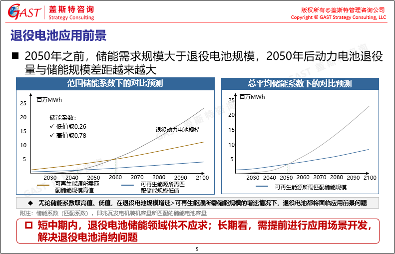 退役電池應(yīng)用前景:2050年之前,儲能需求規(guī)模大于退役電池規(guī)模,2050年后動力電池退役量與儲能規(guī)模差距越來越大。短中期內(nèi),退役電池儲能領(lǐng)域供不應(yīng)求;長期看,需提前進行應(yīng)用場景開發(fā),解決退役電池消納問題。