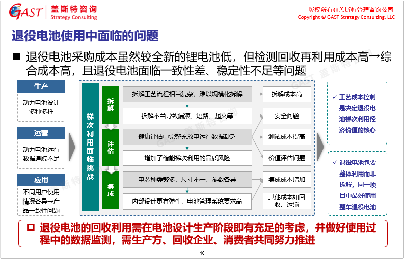 退役電池問題分析:退役電池采購成本雖然較全新的鋰電池低,但檢測回收再利用成本高,且退役電池面臨一致性差、穩(wěn)定性不足等問題。退役電池的回收利用需在電池設(shè)計生產(chǎn)階段即有充足的考慮,并做好使用過程中的數(shù)據(jù)監(jiān)測,需生產(chǎn)方、回收企業(yè)、消費者共同努力推進。