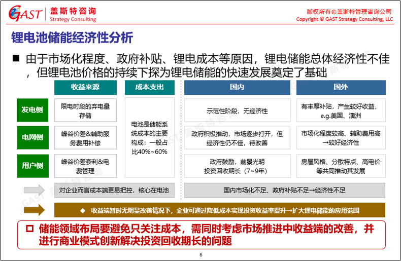 鋰電池儲能經(jīng)濟性分析:由于市場化程度、政府補貼、鋰電成本等原因,鋰電儲能總體經(jīng)濟性不佳,但鋰電池價格的持續(xù)下探為鋰電儲能的快速發(fā)展奠定了基礎(chǔ)。儲能領(lǐng)域布局要避免只關(guān)注成本,需同時考慮市場推進中收益端的改善,并進行商業(yè)模式創(chuàng)新解決投資回收期長的問題。
