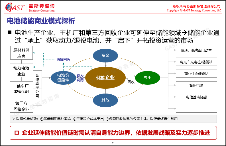 電池儲能商業(yè)模式探析:電池生產(chǎn)企業(yè)、主機廠和第三方回收企業(yè)可延伸至儲能領(lǐng)域。儲能企業(yè)通過“承上”獲取動力/退役電池,并“啟下”開拓投資運營的市場。企業(yè)做儲能延伸的關(guān)鍵是認清自身能力邊界,依據(jù)發(fā)展戰(zhàn)略及實力逐步推進。