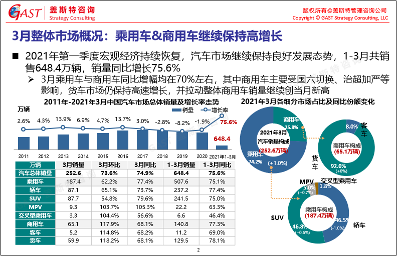 在宏觀經(jīng)濟(jì)持續(xù)恢復(fù)的背景下,汽車市場(chǎng)保持良好發(fā)展態(tài)勢(shì)。2021年第一季度相比2020年同期累計(jì)銷量表現(xiàn)較好,同比大增75.6%,但與2019年相比銷量?jī)H同比增長(zhǎng)1.8%(2019年市場(chǎng)基數(shù)屬于較低水平),車市還有待進(jìn)一步恢復(fù)。本報(bào)告圍繞2021年3月中國(guó)車市銷量走勢(shì)進(jìn)行研究分析。