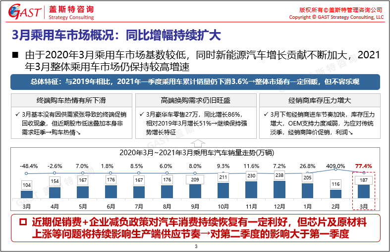 3月乘用車市場(chǎng)概況:由于同期基數(shù)較低,同時(shí)新能源汽車增長(zhǎng)貢獻(xiàn)不斷加大,2021年3月整體乘用車市場(chǎng)仍保持較高增速,但芯片及原材料上漲等問(wèn)題將持續(xù)影響生產(chǎn)端供應(yīng)節(jié)奏,對(duì)第二季度的銷量影響將大于第一季度。