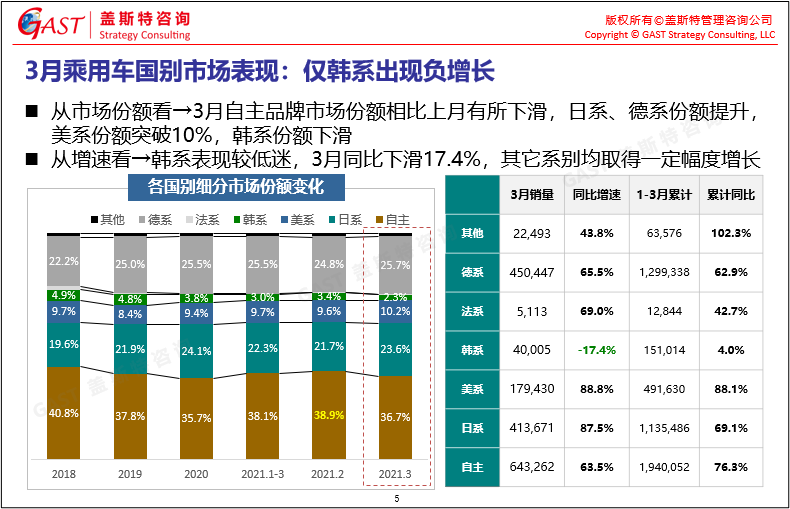 3月乘用車國(guó)別市場(chǎng)表現(xiàn):除韓系銷量下滑外,各派系均大幅增長(zhǎng)。德系、日系、美系份額均有提升,其中美系份額首次突破10%。