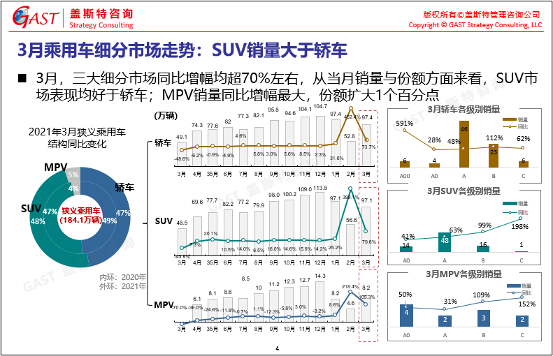 3月乘用車細(xì)分市場(chǎng)走勢(shì):轎車、SUV、MPV市場(chǎng)均同比大幅增長(zhǎng),其中轎車市場(chǎng)兩端效應(yīng)突出→A00級(jí)與B/C級(jí)車表現(xiàn)較好;SUV市場(chǎng)與MPV市場(chǎng)中高端消費(fèi)需求延續(xù)向好態(tài)勢(shì),B/C級(jí)市場(chǎng)保持高速增長(zhǎng)。