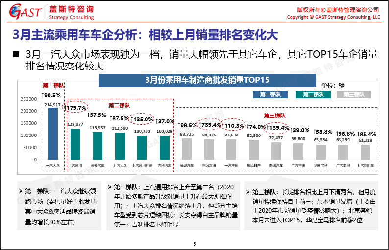 3月主流乘用車車企分析:上汽通用排名上升至第二,長(zhǎng)安汽車排名上升至第三,奪得自主品牌第一名,吉利、長(zhǎng)城排名有所下滑。