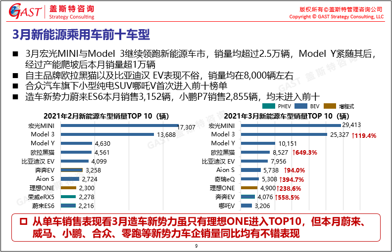 3月新能源乘用車前十車型:宏光MINI與Model 3繼續(xù)領(lǐng)跑新能源車市,銷量均超過(guò)2.5萬(wàn)輛,Model Y緊隨其后,經(jīng)過(guò)產(chǎn)能爬坡后本月銷量超1萬(wàn)輛。