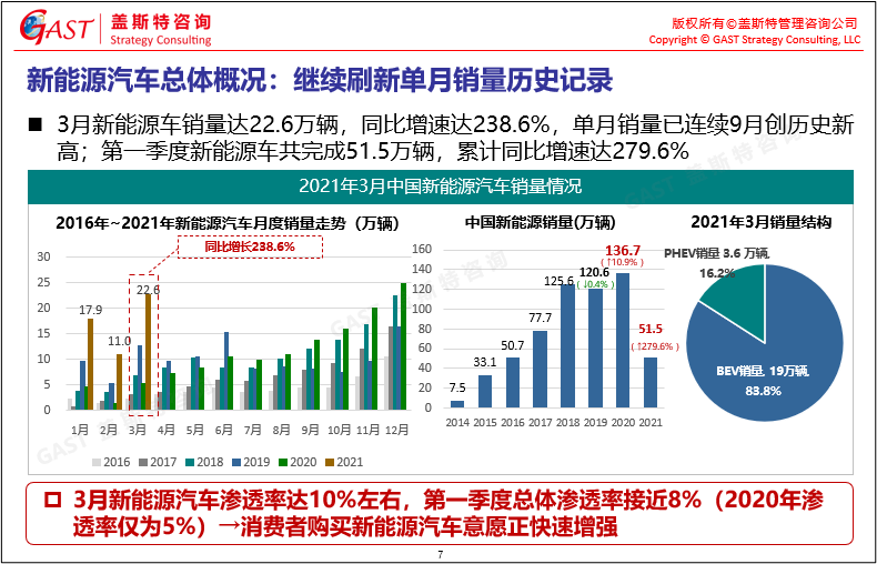 3月新能源汽車總體概況:3月新能源汽車銷量達(dá)22.6萬(wàn)輛(同比增速達(dá)238.6%),新能源汽車銷量占比達(dá)10%左右,一季度總體銷量占比接近8%(2020年僅為5%),消費(fèi)者購(gòu)買新能源汽車意愿正快速增強(qiáng)。