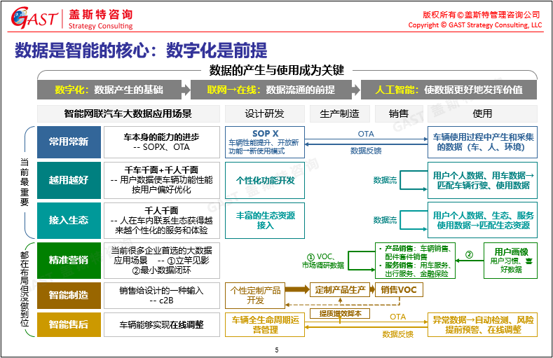 數(shù)據(jù)是智能的核心:行業(yè)愈發(fā)認識到數(shù)據(jù)的產(chǎn)生與使用成為關鍵,現(xiàn)階段以數(shù)據(jù)為核心致力于打造常用常新、越用越好、接入生態(tài)的智能汽車應用場景,下階段將以精準營銷、智能制造、智能售后為數(shù)據(jù)應用的重點。