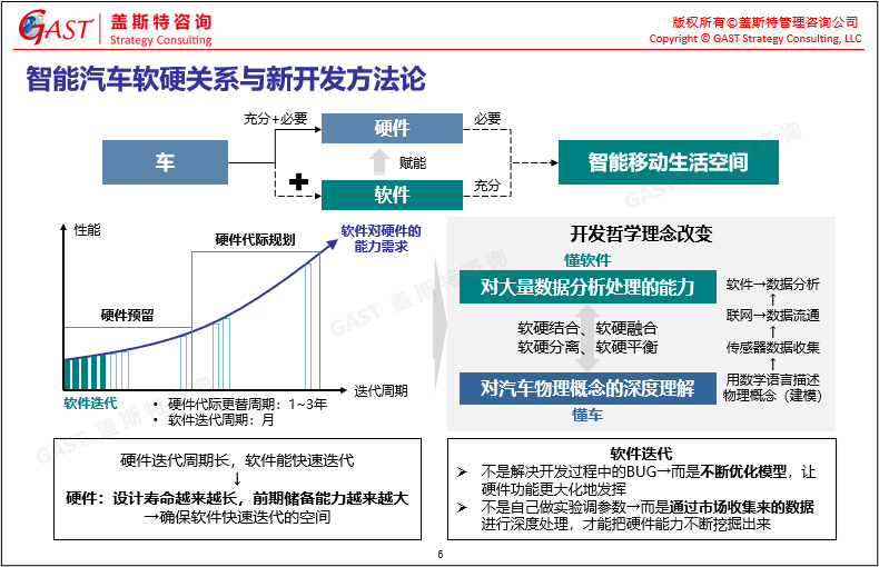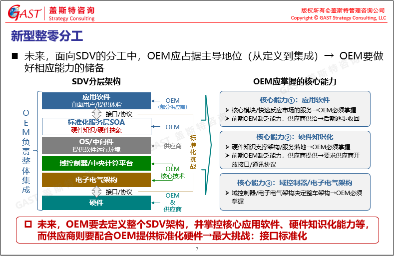 智能汽車新開發(fā)方法論及整零關系:在傳統(tǒng)造車基礎上,智能汽車開發(fā)哲學與理念發(fā)生改變,需同時具備對大量數(shù)據(jù)分析處理的能力以及對汽車物理概念的深度理解,實現(xiàn)軟硬結合、軟硬融合、軟硬分離、軟硬平衡。在此基礎上,未來面向SDV的分工中,OEM在定義到集成等環(huán)節(jié)都應占據(jù)主導地位,需掌握應用軟件、硬件知識化、域控制器等核心能力。
