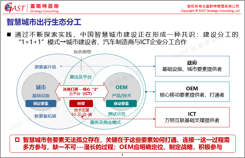 智慧城市出行生態(tài)分工:通過不斷的探索實踐,中國智慧城市建設正在形成一種共識:“1+1+1”模式,由城市建設者、汽車制造商與ICT企業(yè)分工合作。政府作為基礎設施、城市要素提供者,OEM作為核心移動要素提供者、打通者,ICT作為萬物互聯(lián)基礎支撐提供者,各要素無法孤立存在,關鍵在于這些要素如何打通、連接,在此過程中需多方參與,缺一不可。