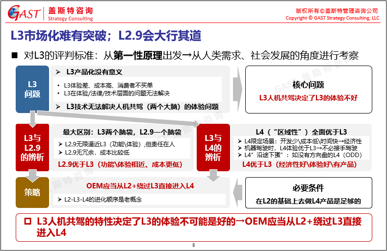 不同級別自動駕駛布局策略:L3人機共駕的特性決定了L3的體驗不可能是好的,L3市場化難有突破,L2.9會大行其道,OEM可從L2+繞過L3直接進入L4。而企業(yè)從L2到L4可以沿途下“蛋”,通過小范圍示范,推出各類新產(chǎn)品,實現(xiàn)在特定示范區(qū)或場景下一定數(shù)量的L4產(chǎn)品落地。