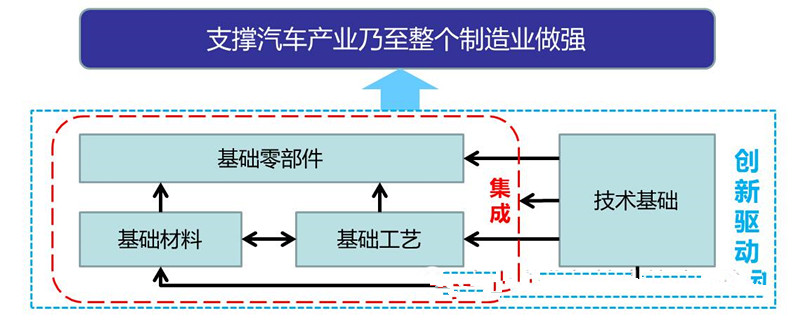 從汽車產(chǎn)業(yè)自身發(fā)展的角度看,汽車四基是實(shí)現(xiàn)汽車強(qiáng)國的根本;從工業(yè)強(qiáng)基工程的角度看,四基研究必須有應(yīng)用的載體。而汽車產(chǎn)業(yè)牽連面廣、關(guān)聯(lián)度高、規(guī)模效應(yīng)顯著,利于形成四基的整體創(chuàng)新能力以及基礎(chǔ)研究的體系與標(biāo)準(zhǔn),因此,對(duì)工業(yè)強(qiáng)基工程而言,汽車強(qiáng)基可謂是最佳突破口。具體如圖3所示。