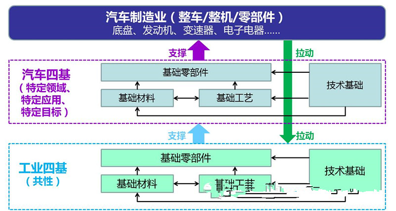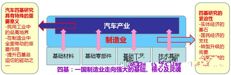總之,汽車四基是工業(yè)四基的延展和應(yīng)用,它既是工業(yè)四基的重要組成部分,又以工業(yè)四基為支撐,更是汽車制造業(yè)發(fā)展直接的重要支撐,居于承上啟下的關(guān)鍵地位。