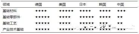 作為全球汽車制造業(yè)的強(qiáng)國,德國、美國、日本和韓國政府對(duì)汽車產(chǎn)業(yè)基礎(chǔ)均高度重視。總體來說,德國和日本的汽車工業(yè)四基發(fā)展最為全面,綜合實(shí)力最強(qiáng);美國在基礎(chǔ)材料領(lǐng)域有較強(qiáng)實(shí)力,但基礎(chǔ)工藝領(lǐng)域不占優(yōu)勢(shì);韓國近年來雖然在汽車產(chǎn)業(yè)四基方面有了長(zhǎng)足進(jìn)步,不過總體上四基能力還是落后于德美日三國。在研究中,對(duì)德美日韓中五國汽車產(chǎn)業(yè)四基的發(fā)展?fàn)顟B(tài)與關(guān)鍵數(shù)據(jù)進(jìn)行了調(diào)研分析,并組織汽車領(lǐng)域?qū)<医M,結(jié)合專業(yè)知識(shí)和經(jīng)驗(yàn),綜合評(píng)估了各國的四基水平,給出了直觀的評(píng)價(jià)結(jié)果,如表1所示。
