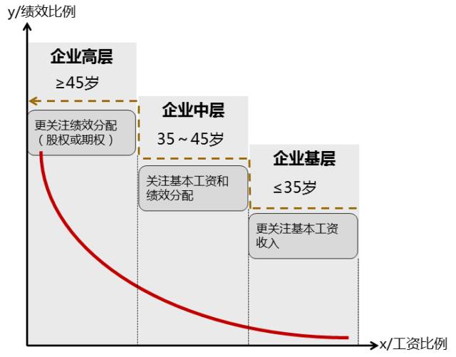 最后,在人才的保留方面,靈活而適宜的人才激勵機(jī)制不可或缺。近年來汽車產(chǎn)業(yè)的人才頻頻轉(zhuǎn)戰(zhàn)IT產(chǎn)業(yè),其背后的原因是多方面的,但能否針對不同層次的人才提供有吸引力的激勵無疑是最重要的因素之一。在這方面我們研究并提出了不同層級人才激勵的一般性模型,如圖2所示。根據(jù)職場上的不同層級,可將員工劃分為基層、中層和高層,從年齡分布上通常對應(yīng)于35歲以下、35-45歲之間以及45歲以上。不同層級和年齡段的員工對不同形式的激勵有不同的敏感度。35歲以下的基層員工,面臨成家立業(yè)、購房置車的經(jīng)濟(jì)壓力,相比于帶有不確定因素的績效獎勵,更注重基本薪資的收入水平;35-45歲之間的員工很多已經(jīng)是企業(yè)中層的管理者和骨干,他們的事業(yè)和生活通常有了初步的基礎(chǔ),在關(guān)注穩(wěn)定的工資收入的同時,也開始在意績效的分配;而45歲以上,不乏小有成就的企業(yè)高層,他們往往更追求事業(yè)的成就感,此時短期收益的吸引力漸趨下降,作為長期回報的股權(quán)與期權(quán)則成為最終的“核動力”,通過這一手段可以將企業(yè)收益與高層績效相掛鉤,形成正向循環(huán)的有效激勵。因此,千篇一律或者吝惜分享的激勵方式,無法有效保留優(yōu)秀的人才,更難以應(yīng)對未來人才跨界跳槽的挑戰(zhàn),只有根據(jù)不同人才的需求采取有針對性的激勵機(jī)制,才能更好地調(diào)動人才的積極性,最終在激烈的競爭中牢牢掌握住最核心的人才資源。