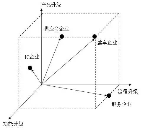 圖2 智能網(wǎng)聯(lián)汽車產(chǎn)業(yè)中不同類型企業(yè)的升級(jí)路徑