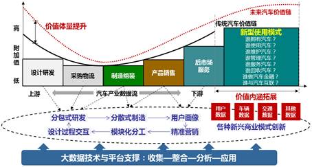 當(dāng)前,能源、互聯(lián)與智能三大革命,正在引發(fā)汽車(chē)產(chǎn)業(yè)的全面重構(gòu)和汽車(chē)文明的重新定義,汽車(chē)的產(chǎn)品形態(tài)、制造體系、創(chuàng)新模式與產(chǎn)業(yè)生態(tài)都將和過(guò)去大不相同。汽車(chē)產(chǎn)業(yè)從造車(chē)端到用車(chē)端的整個(gè)價(jià)值鏈條的各環(huán)節(jié),都將持續(xù)產(chǎn)生數(shù)據(jù)并利用數(shù)據(jù)不斷自我優(yōu)化,從而與大數(shù)據(jù)緊密地聯(lián)系在一起。如圖1所示,通過(guò)用戶(hù)數(shù)據(jù)、車(chē)輛數(shù)據(jù)、交通數(shù)據(jù)以及其他相關(guān)數(shù)據(jù)的收集、整合、分析與應(yīng)用,包括分包式研發(fā)、分散式制造、用戶(hù)畫(huà)像、精準(zhǔn)營(yíng)銷(xiāo)、模塊化分工以及設(shè)計(jì)過(guò)程交互等在內(nèi)的各種相互交織、彼此影響的商業(yè)模式創(chuàng)新,全都成為可能,不僅將使從汽車(chē)設(shè)計(jì)研發(fā)、采購(gòu)物流、制造組裝到產(chǎn)品銷(xiāo)售及后市場(chǎng)服務(wù)的全產(chǎn)業(yè)鏈附加值得到程度不同的全面提升,而且還將極大地?cái)U(kuò)展汽車(chē)產(chǎn)業(yè)原有的價(jià)值內(nèi)涵,為汽車(chē)產(chǎn)業(yè)帶來(lái)無(wú)窮多種的全新可能和前所未有的巨大機(jī)遇。