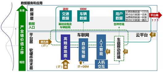 隨著大數(shù)據(jù)及相關(guān)技術(shù)的突破與發(fā)展,真正掌握數(shù)據(jù)的一方或幾方將處于未來(lái)產(chǎn)業(yè)價(jià)值鏈中的核心地位。這些數(shù)據(jù)的掌控者是多源的,傳統(tǒng)汽車(chē)制造商只是其中之一。如圖3所示,掌握交通等數(shù)據(jù)的政府、掌握車(chē)輛數(shù)據(jù)的汽車(chē)企業(yè)(OEM)以及掌握各種不同用戶(hù)數(shù)據(jù)的信息產(chǎn)業(yè)巨頭及汽車(chē)企業(yè)等,都在未來(lái)產(chǎn)業(yè)價(jià)值鏈的核心區(qū)域即數(shù)據(jù)層占據(jù)一席之地。而從數(shù)據(jù)的平臺(tái)層和軟硬件技術(shù)層來(lái)看,通訊商、地圖商、IT企業(yè)及汽車(chē)企業(yè)等也都是有力的參與者。三個(gè)不同維度之間將通過(guò)車(chē)聯(lián)網(wǎng)和云平臺(tái)有機(jī)地聯(lián)接在一起,未來(lái)或?qū)⒊霈F(xiàn)平臺(tái)商來(lái)完成這些大數(shù)據(jù)的整合及應(yīng)用。