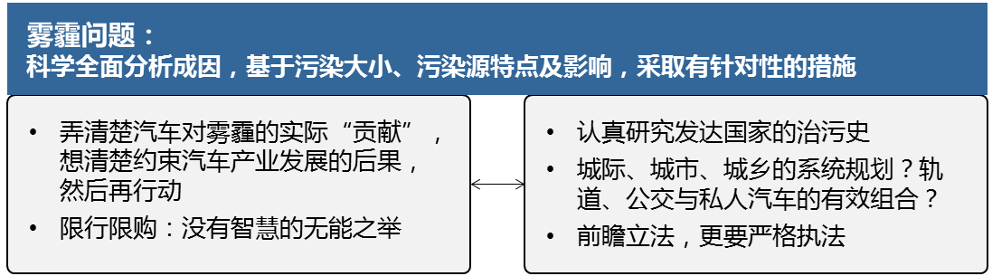 最后來看一個全社會最為關(guān)注的焦點問題——霧霾??梢哉f,我們立法和執(zhí)法的缺陷在這個案例中一覽無余:第一、沒有認(rèn)真吸取歷史的經(jīng)驗教訓(xùn)。工業(yè)化污染非自中國始,50年代的倫敦、60年代的洛杉磯、70年代的東京,“光化學(xué)煙霧”和“毒霧”的先例比比皆是。作為后發(fā)的中國,卻沒能充分研究這些發(fā)達(dá)國家的歷史進(jìn)程,前瞻性地立法或制定預(yù)案,來避免今天全國的一片霧霾。第二、霧霾顯然是一個系統(tǒng)問題,而我們對其缺乏科學(xué)全面的分析,如此也就不可能提出有效的綜合解決方案。例如汽車對霧霾的貢獻(xiàn)到底有多大?一些數(shù)據(jù)認(rèn)為機(jī)動車排放的貢獻(xiàn)超過20%,是首要因素,一時之間汽車仿佛就成了千夫所指。但這20%的數(shù)據(jù)的科學(xué)性及系統(tǒng)性備受質(zhì)疑。另外,剩下的80%又是什么,何以不是首要因素?在這里我無意為汽車污染辯護(hù),只是希望相關(guān)部門能對霧霾進(jìn)行系統(tǒng)科學(xué)的研究,找出霧霾的真正“罪魁禍?zhǔn)住?,加以系統(tǒng)整治。如果汽車污染確實是霧霾的主要貢獻(xiàn)者,那就必須采取更有效的應(yīng)對措施;否則把矛頭指向汽車,豈不是既限制了百姓的便捷出行、制約了支柱產(chǎn)業(yè)的健康發(fā)展,又沒能真正解決霧霾問題嗎!第三、針對汽車所造成的污染,我們的解決措施缺乏系統(tǒng)性、針對性和有效性。首先,機(jī)動車包含乘用車、商用車、摩托車還有黃標(biāo)車,這些交通工具里面哪種污染最大答案應(yīng)該不難知曉,但遺憾的是我們并未因污染大小而采取有針對性的措施。其次,如前所述,目前并不是排放標(biāo)準(zhǔn)制定得不嚴(yán)格,而是法規(guī)執(zhí)行得不嚴(yán)格。2013年在全國推行國四標(biāo)準(zhǔn)的中國,汽車保有量大約1.2億輛,而歐洲實施同樣標(biāo)準(zhǔn)時的汽車保有量超過2億輛,但歐洲沒有發(fā)生霧霾。在這里我不想花時間去談汽車以外造成霧霾的因素,僅就汽車而言,北京現(xiàn)在雖然實行國五,但只限于新車,對路上運行車輛的實際情況并無監(jiān)測處罰機(jī)制;同時對于不能滿足法規(guī)且數(shù)量更多的老舊車輛,也沒有加快汰換的舉措。此外,與汽車排放控制技術(shù)必須同步的油品質(zhì)量,長期滯后于標(biāo)準(zhǔn),卻從來沒有相應(yīng)的問責(zé)和處罰。最后,很多城市與北京一樣,甚至出臺了“霧霾嚴(yán)重超標(biāo)天氣強(qiáng)制性限制車輛上路”的措施,仿佛除此再無良策了。這種短期的“限”和“治”,既不科學(xué),也不可能真正實現(xiàn)環(huán)境保護(hù)的長治久安!只有政府從科學(xué)立法、嚴(yán)格執(zhí)法的高度出發(fā),系統(tǒng)地思考、分析并采取有針對性的綜合治理方案,才能從根本上解決百姓呼吸高質(zhì)量空氣的問題(參見圖1.4)。東京圈人口比北京多70%,面積約為北京的3/4,而汽車保有量是北京的近3倍,但是東京沒有霧霾,也不堵車,這樣的對比難道不應(yīng)該引起我們的深思嗎?