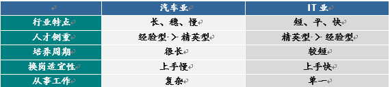 那么汽車行業(yè)到底需要什么樣的人才?我個人認為,更需要的不是精英,而是基礎扎實、專業(yè)精深,同時知識面寬、適應性強的人才,因為汽車從業(yè)者需要和其他領域的很多人打交道,更要在很多特殊情況下解決各種復雜問題。實際上,汽車行業(yè)與IT行業(yè)的人才需求有著質的區(qū)別,這可以從幾方面來講。一是行業(yè)特點。汽車行業(yè)是長、慢、穩(wěn),IT行業(yè)則是短、平、快。二是人才側重點。在汽車行業(yè),精英型人才遠沒有經驗型人才重要,而IT行業(yè)更傾向于精英型人才。三是培養(yǎng)周期。汽車行業(yè)人才培養(yǎng)周期很長,因為要從最初的畫圖開始鍛煉,IT行業(yè)不一樣,很多沒上過大學的人也能編出一流的軟件。四是換崗的適應性。汽車行業(yè)上手慢,挖來的人沒有半年時間做不出成績,IT行業(yè)就不一樣了。五是工作的內容。汽車行業(yè)的工作非常復雜,IT行業(yè)相對單一。參見表4.1。因此汽車行業(yè)在培養(yǎng)人才的時候一定要有耐心,否則,你很難期望挖來的人有產出,就算有產出也很難達到預期的程度。