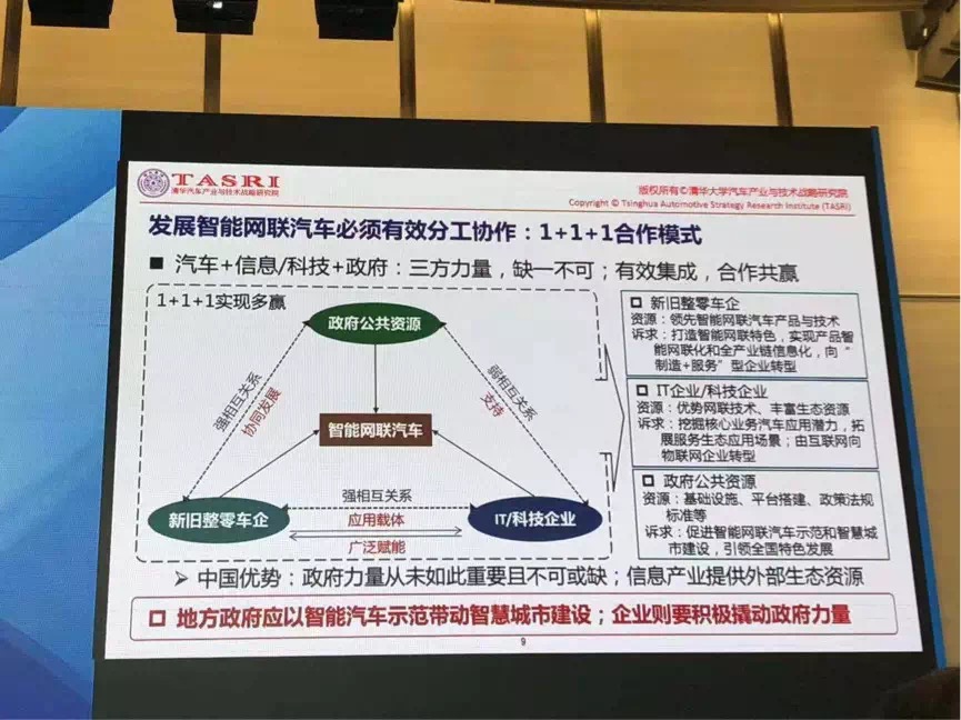 趙福全提出了發(fā)展智能網(wǎng)聯(lián)汽車(chē)的“1+1+1”模式,即汽車(chē)+信息/科技+政府。發(fā)展智能網(wǎng)聯(lián)汽車(chē),這三方力量缺一不可,同時(shí)也需要三者有效分工協(xié)作、有效集成,最終才能實(shí)現(xiàn)合作共贏。